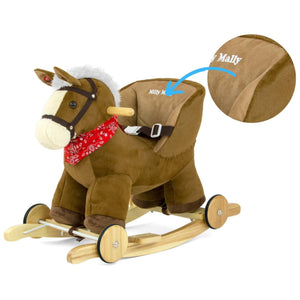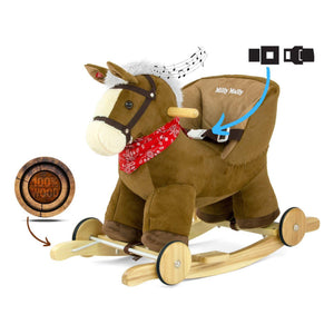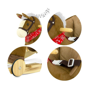 De rocker is gemaakt van zacht en delicaat aanvoelend pluche materiaal. Het heeft ook een nekband, halster, voetsteunen op skids en interactieve oren. Als je op een van de oren drukt, klinkt er galopperend paard en brullen, terwijl je het andere aanraakt, hoort het kind het paard vrolijk brullend paard.