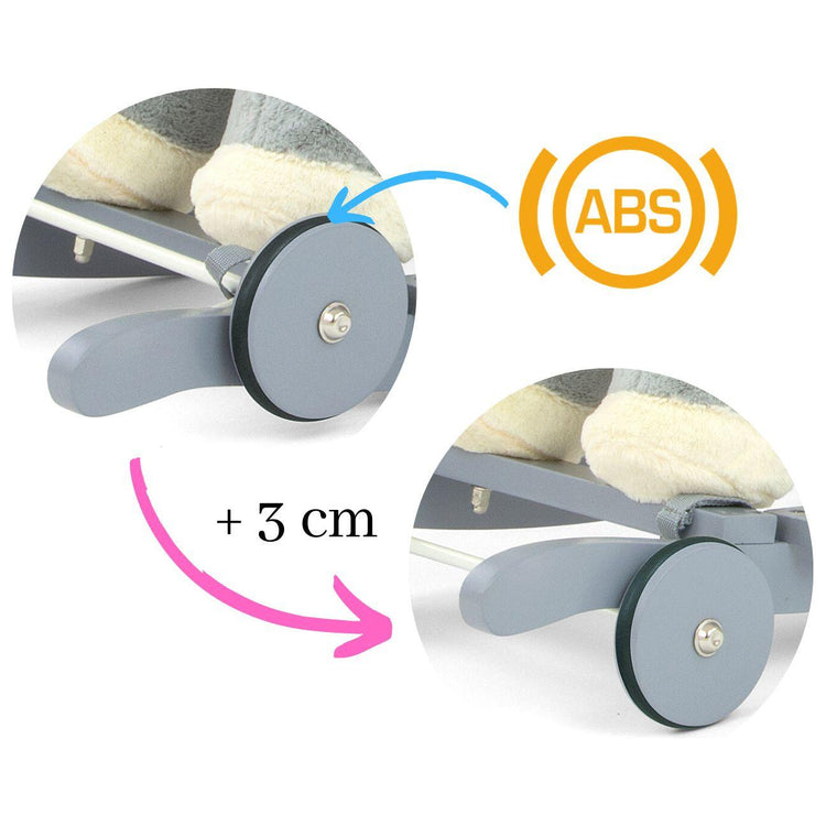 Het paard heeft houten palen met voetsteunen en handvatten om het evenwicht te bewaren tijdens het spelen en een set opvouwbare wielen zodat je er in enkele seconden een prachtig pluchen voertuig van kunt maken.