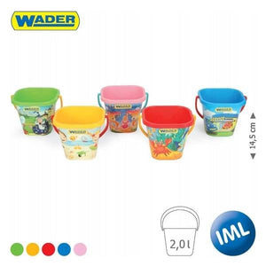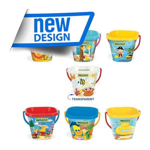 Vierkante emmer met een inhoud van 2 liter. Het speelgoed is verkrijgbaar in vijf verschillende kleurvarianten. Elke variant is versierd met een andere afbeelding.