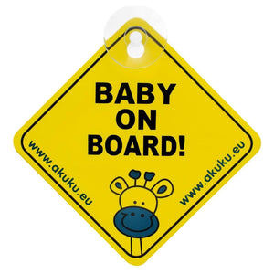 Akuku brand board sign "baby on board" with information for drivers that there may be children in the car. Attached to the windshield with a suction cup.