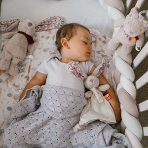 The rabbit mascot with music box is a smiling companion for daily play, which stimulates the development of your little one. The sounds coming from the music box soothe and allow your baby to focus his attention on the toy. The rabbit's long ears encourage pulling and grasping, and the soft fur makes the mascot pleasant to touch.