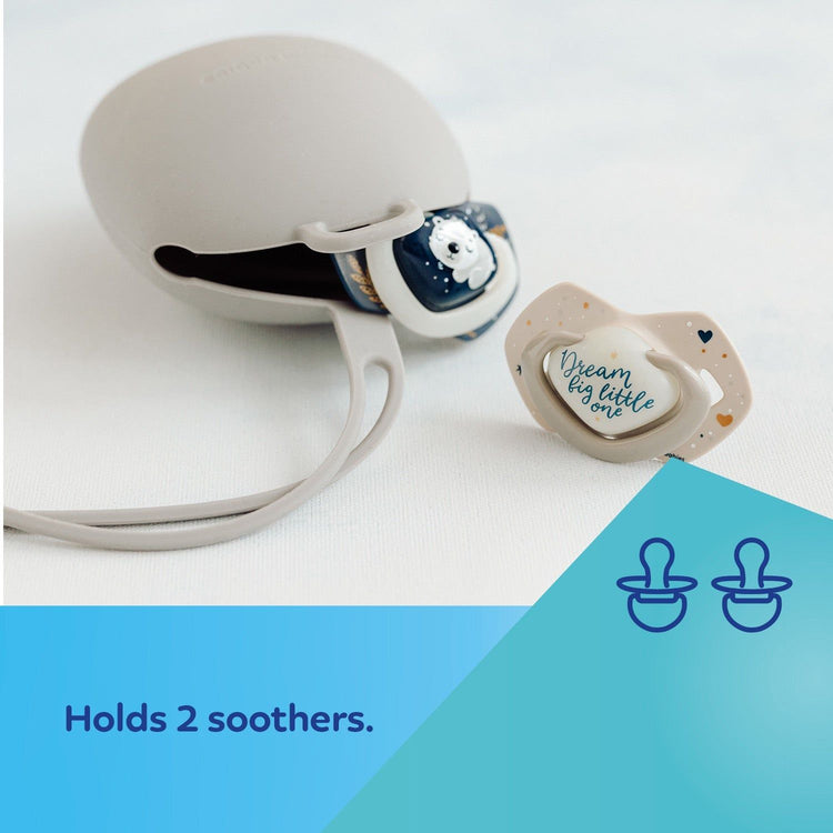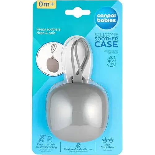 Silicone soother case will protect your baby's favorite soother during walks, travel and at home. Beautiful and practical, silicone soother case will keep two standard-sized soothers, which will always be clean and ready to use. The case has a compact shape and a comfortable practical handle with which it can be easily attached to a pram, cot or bag, so that the soothers are always at hand. Canpol babies soother case is made of flexible and soft silicone, which makes it comfortable to use and easy to clean. Minimalistic design is suitable for every mum's bag.