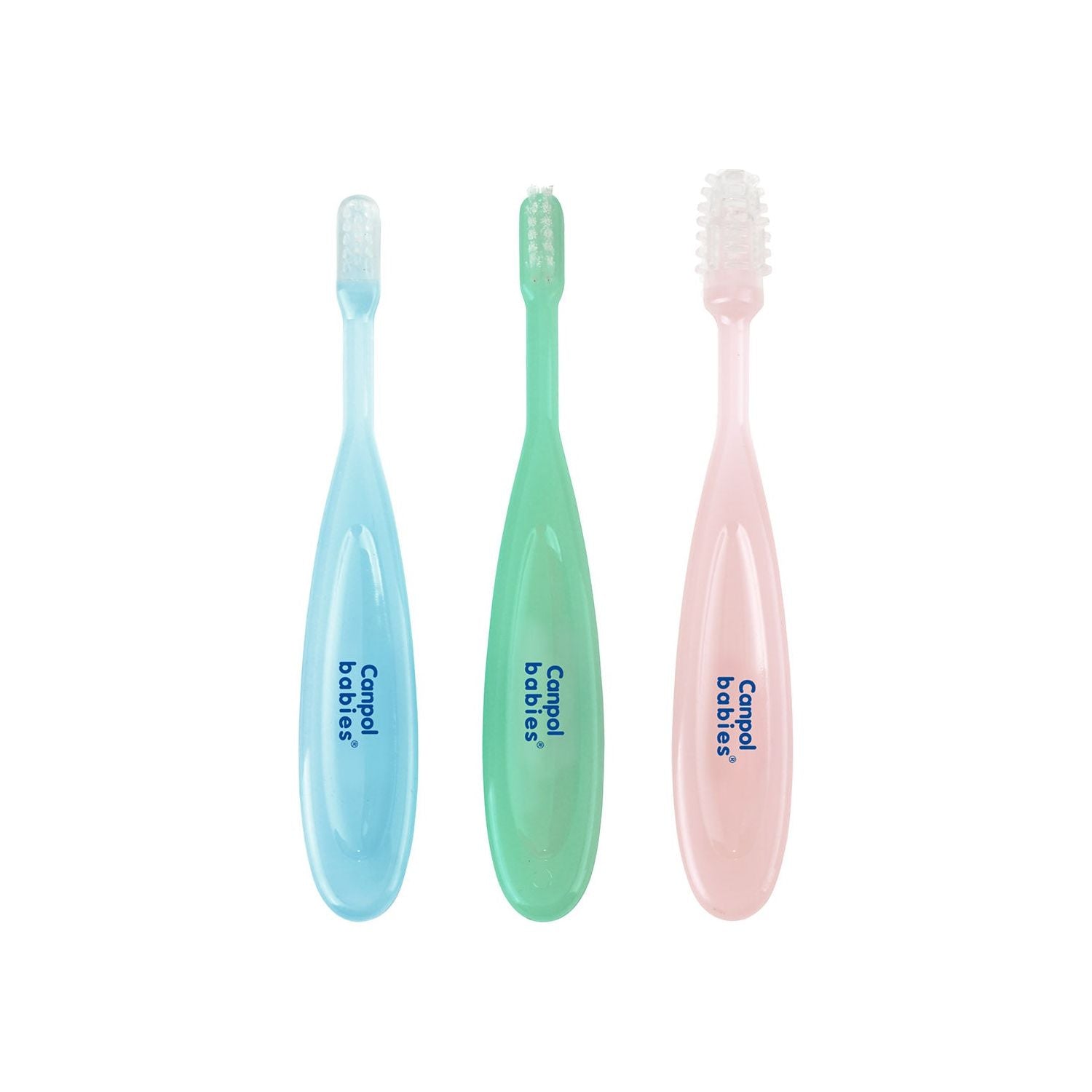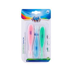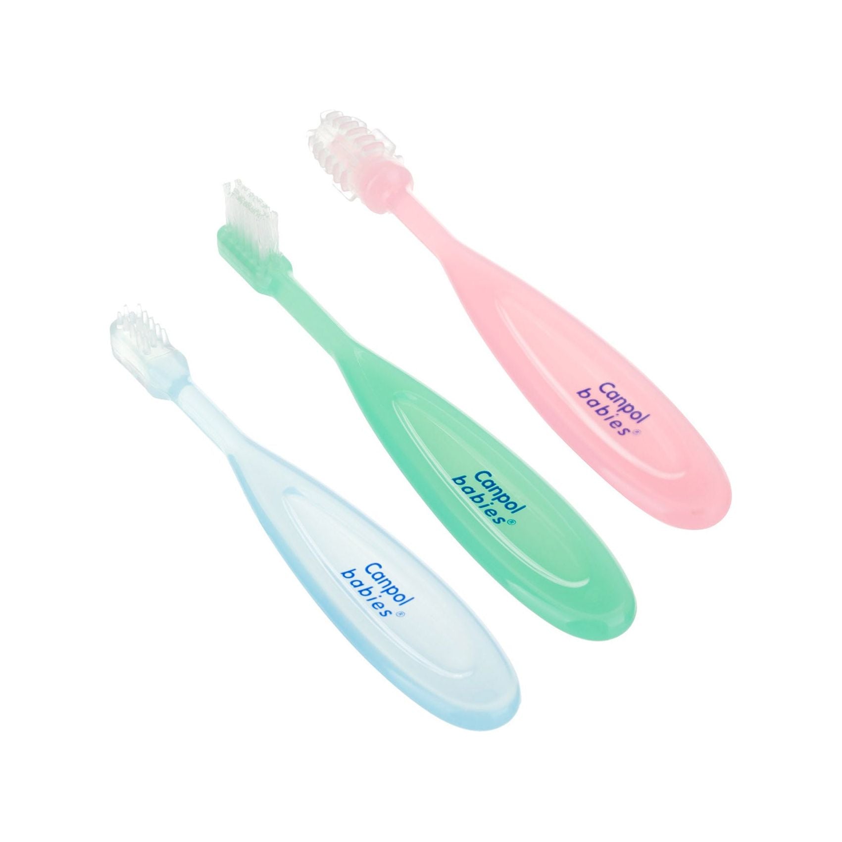 Practical set of brushes for daily care, which will serve the child for several years. It consists of a massage brush, a rubber brush for cleaning the first teeth and a brush with nylon bristles designed for older children. Set allows gentle cleaning of the gums and first teeth without damaging them.