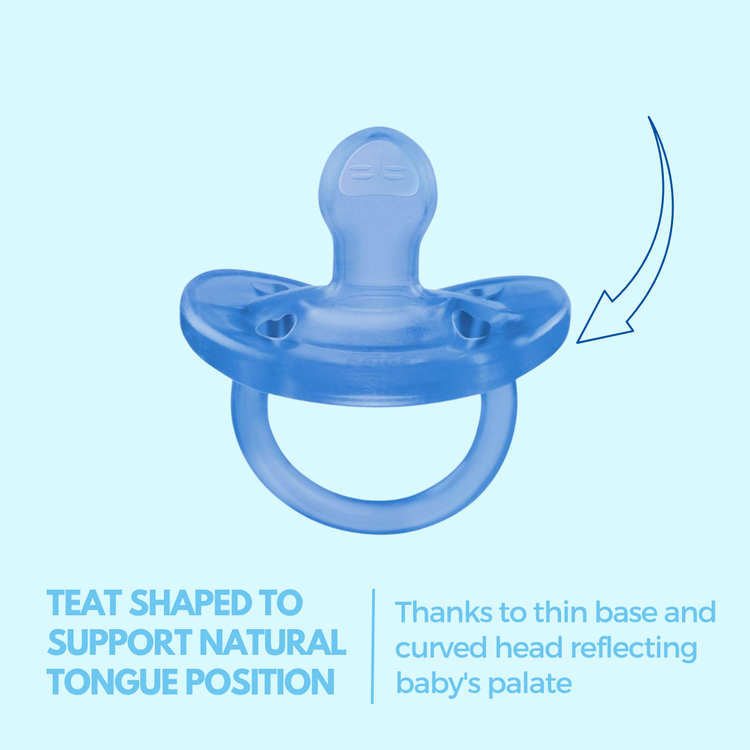 - Breathing - The anatomical shape of the pacifier supports the natural positioning of the tongue, where the airway remains open, allowing free breathing through the nose.