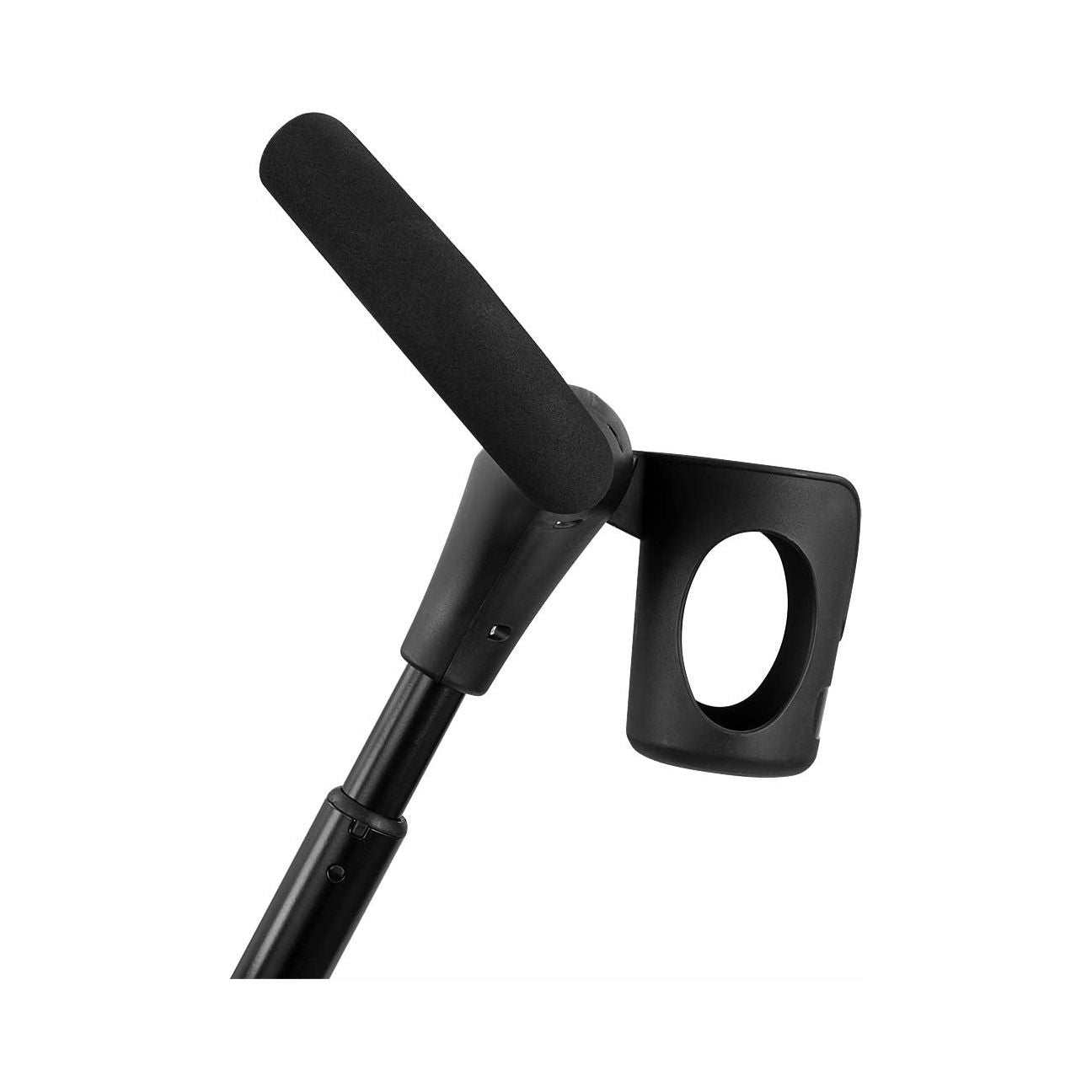 Includes a safety railing, 3-point harness with shoulder pads, and non-slip rubber grips. Solid front wheel prevents accidental foot rotation. -