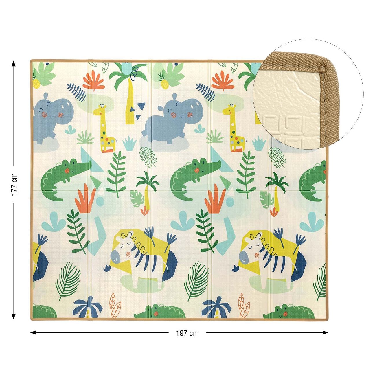Are you looking for a mat, a floor for a tent, a foldable rocker to be used on the swimming pool, a playmat for a garden party, a picnic blanket and/or a beach mat? Believe it or not, this kids playroom flooring fulfils all these functions! Its reversible, mellow, warm and anti-slipping structure allows not only for lying but for first attempts of sitting and developing motor skills.