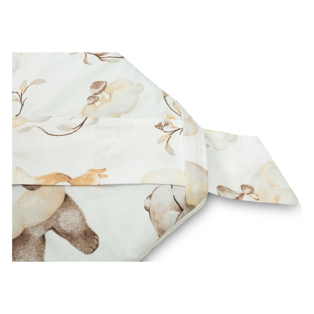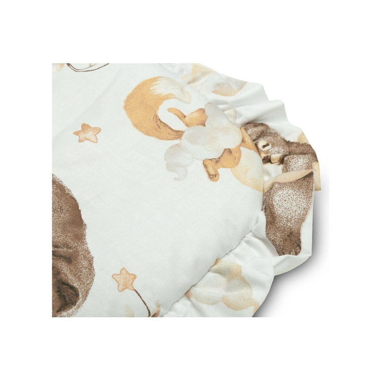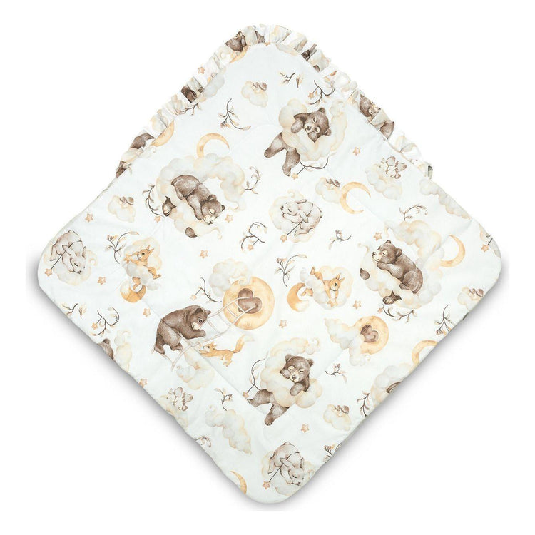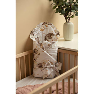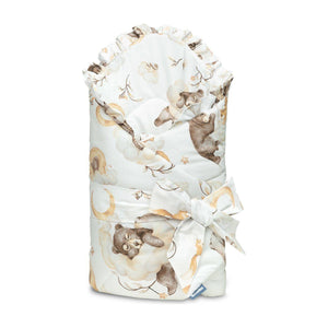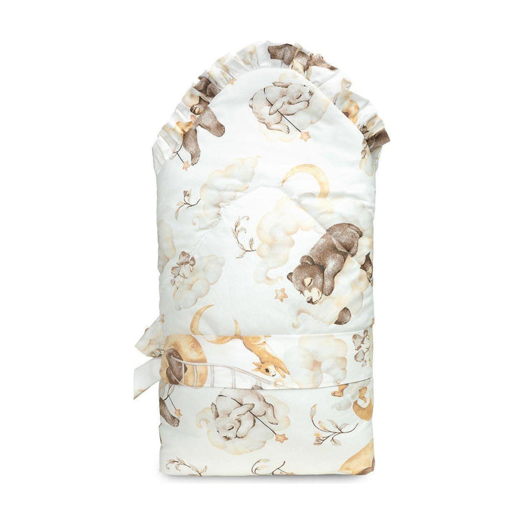 The double-sided baby swaddle with frill has been created with newborns and babies in mind. The knotted fastening with a wide cotton ribbon allows you to comfortably hold your baby during feeding and putting them to sleep. When unfolded, the swaddle can be successfully used as a duvet for a cot or pram. It can also be used as a playmat. It is made of 100% cotton. The filling of the cone is silicone fluffy fleece. It is finished with a tasteful frill.