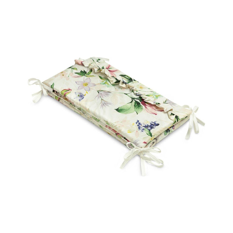 Sensillo Cot Bumper With Frill is a perfect addition to the layette for your baby. The padding will protect your baby and beautiful materials will be great decor for the baby's room. One side of the bumper is made of soft, printed cotton, and the other is high-quality cuddly velvet material. Numerous ribbons keep the protector in the right position. It was designed for a cot with dimensions of 120x60 cm.