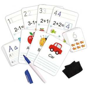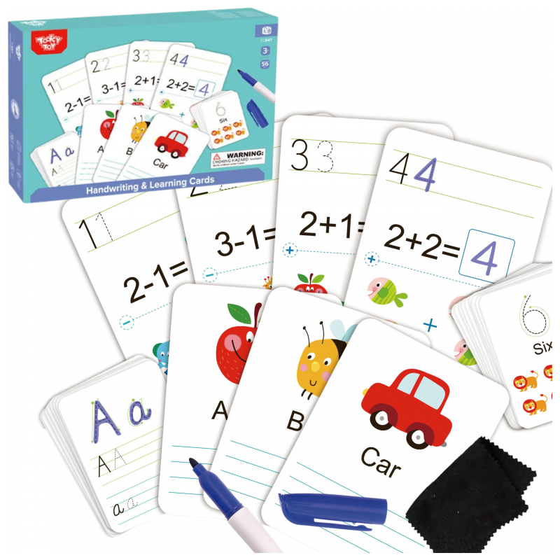TOOKY TOY Educational Cards are a great gift idea. The set is made so that your child can practice spelling again and again with the included erasable marker and cloth. Your little one will have the opportunity to come to precision in the difficult art of writing and counting. On top of that, she will learn the first words in English.