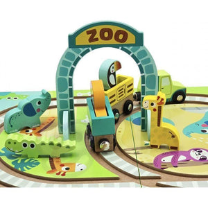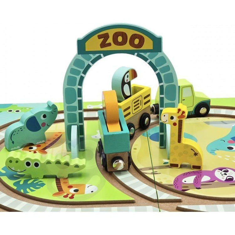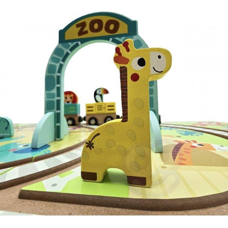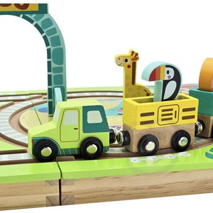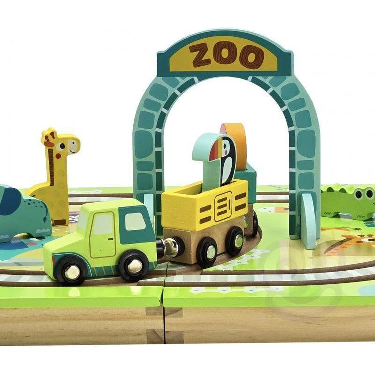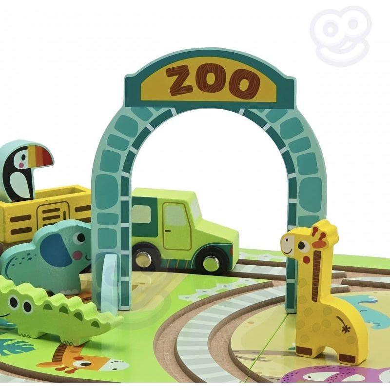 The colorful wooden play set from Tooky Toy brand is not only a unique attraction for the little ones, but also a practical solution for parents. It offers children not only a zoo-themed train track layout with adorable animal figures, but also a wooden vehicle with magnetically attached wagons that enters the zoo through a charming gate.