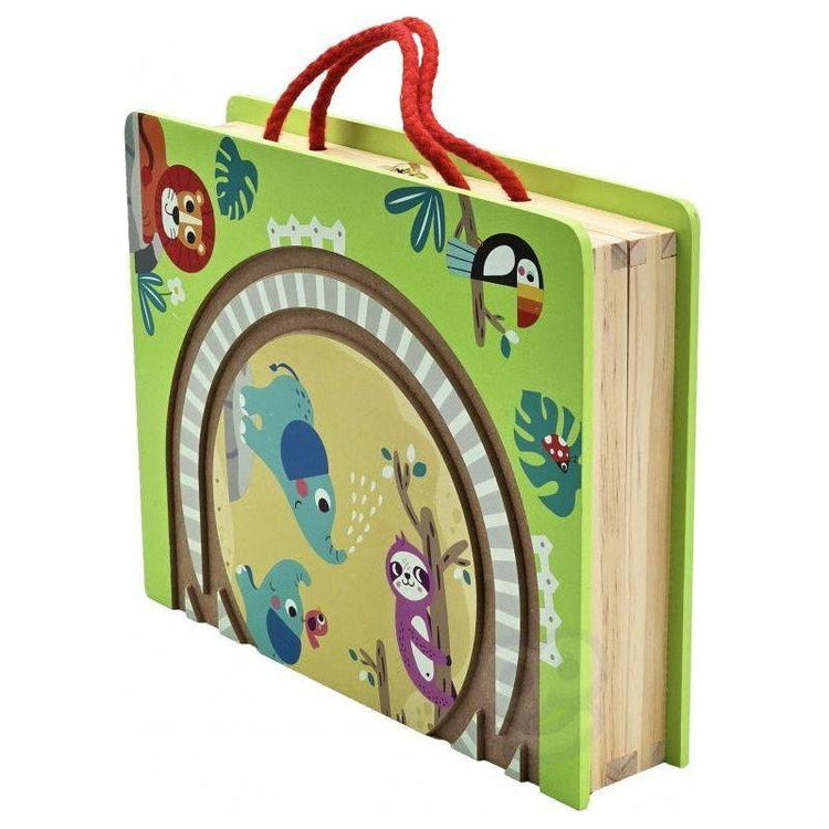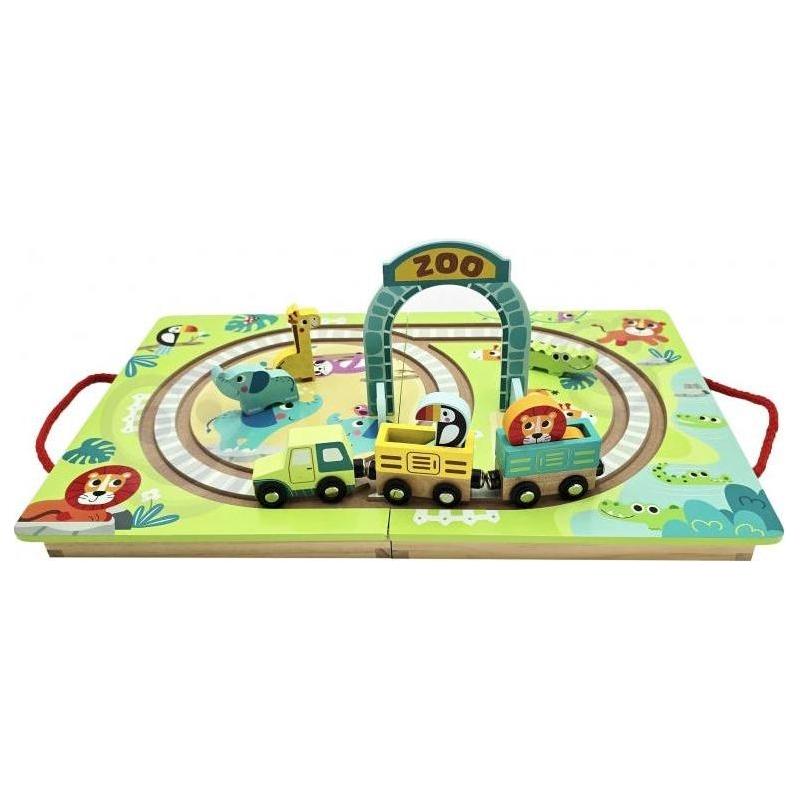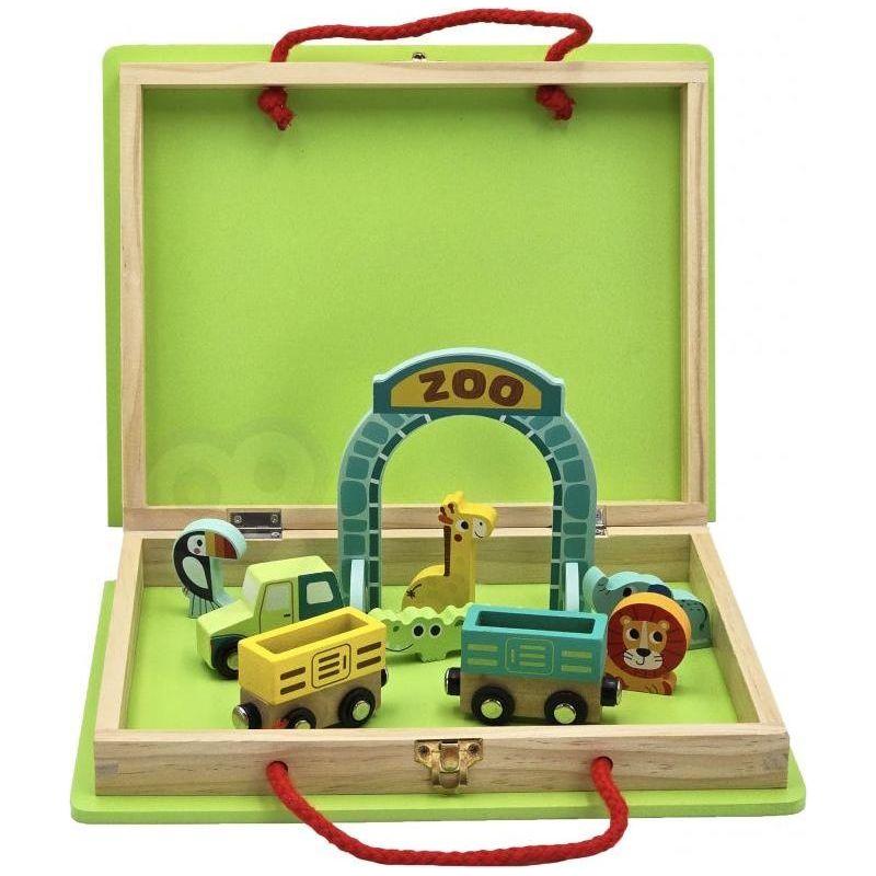 - The set includes: wooden tracks in the form of a suitcase, a vehicle with magnet wagons, 5 animals and a folding zoo gate