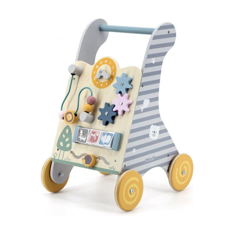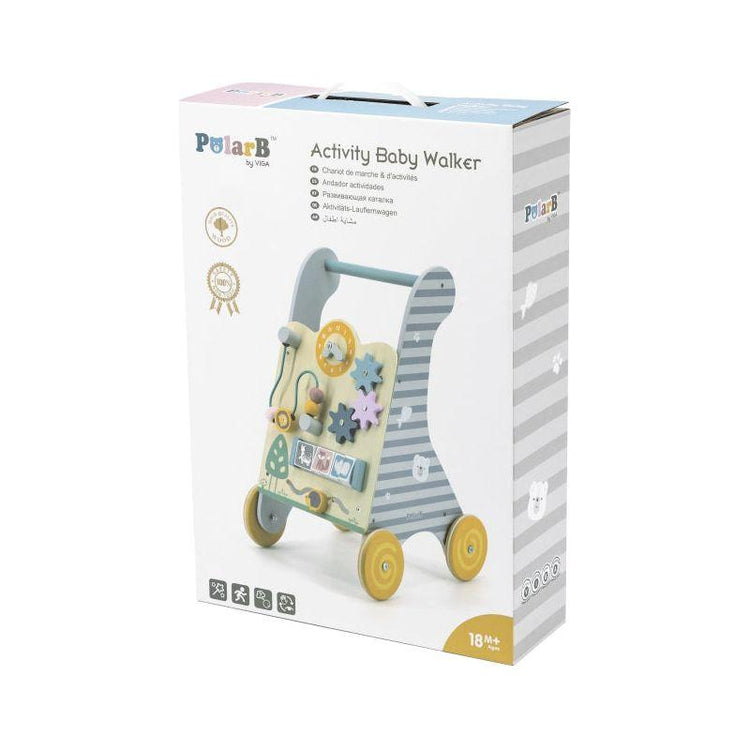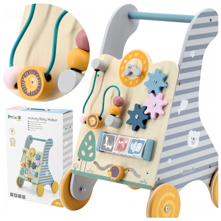 Educational baby pusher designed by respected toy manufacturer Viga Toys. The toy is designed for children from 18 months. The functional toy for the youngest serves simultaneously as a walker and an educational panel thanks to which the child learns to match shapes and colors. Rotating elements in the form of gears, tracks with animals on the panel and its sides will interest the toddler and make play more attractive.
