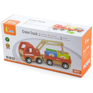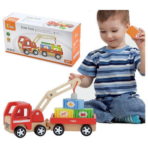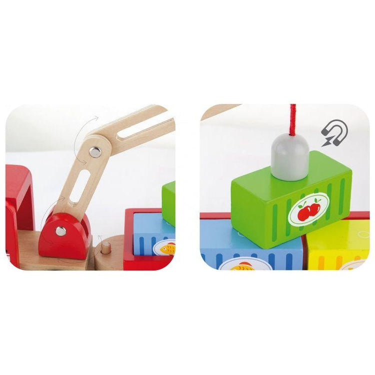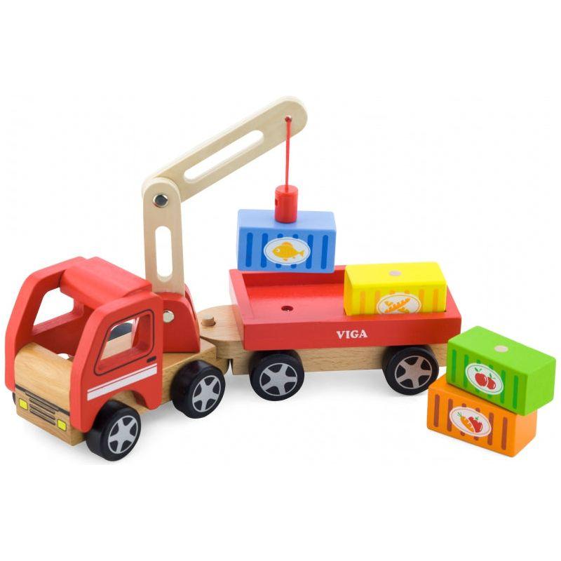 The Wooden Crane has a movable arm and 4 wooden containers equipped with magnets so they can be lifted. The base of the crane is rotatable. Colorful crane with containers pleases the eye and encourages play. The trailer can be detached from the vehicle by pulling it off the wooden peg.